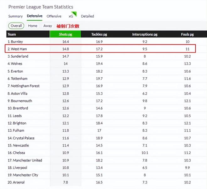 本赛季西汉姆联在英超场均被射门次数达到14.8次,只比联赛排名倒数第二的伯恩利少,比其他球队都要多。相比之下,曼城场均被射门10.1次,排名英超第二少。