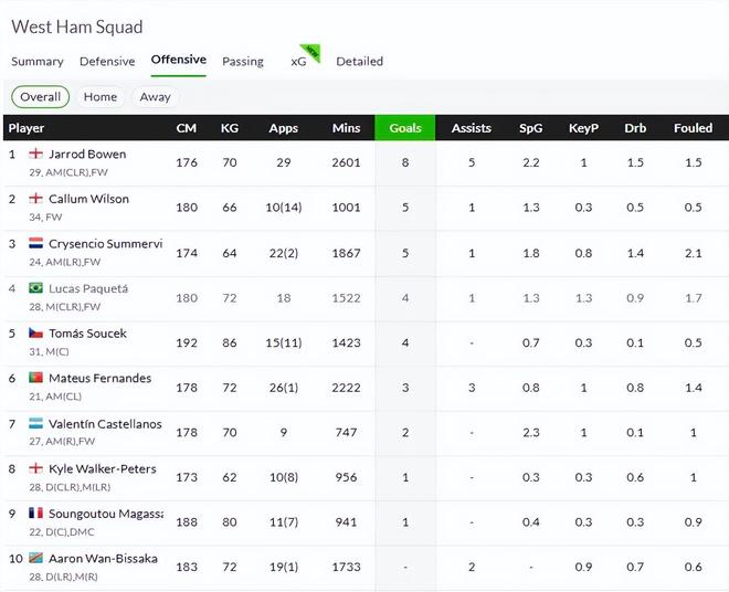 本赛季西汉姆联的进攻表现不好,是导致他们排名不高的关键原因。前29轮英超过后才打入35球,在帕奎塔离队后,本赛季英超有过进球的球员一共才8人,进球最多的是鲍文。